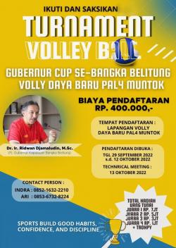 Kamis , - 15:38:45 WIB Suarasido.com, Bangka Belitung - Pradekku !! Ade kabar gembira untuk ikak masyarakat Bangka Belitung pecinta olah raga bola voli.Dikabarkan Pj Gubernur Kepulauan Bangka Belitung Ridwan Djamalludin putra Babel daerah kelahiran Muntok Kabupaten Bangka Barat berkolaborasi dengan Volly Daya Pall 4 Muntok menggelar kejuaraan bola voli se-Bangka Belitung.Kepada jejaring media ini, kabar gembira itu disampaikan oleh Samsidi Ketua Panitia Pelaksana Tournament Volley Ball Gubernur Cup...