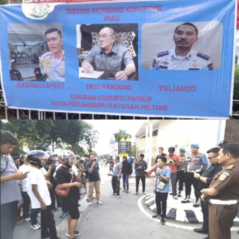 Korlap Roy menuntut agar korupsi parkir Kota Pekanbaru diusut tuntas dan melibatkan pengusaha inisial DH, Kadishub Kota Yuliarso, dan kabid UPT perparkiran Radinal, diduga kerugian Negara hingga ratusan milyar.