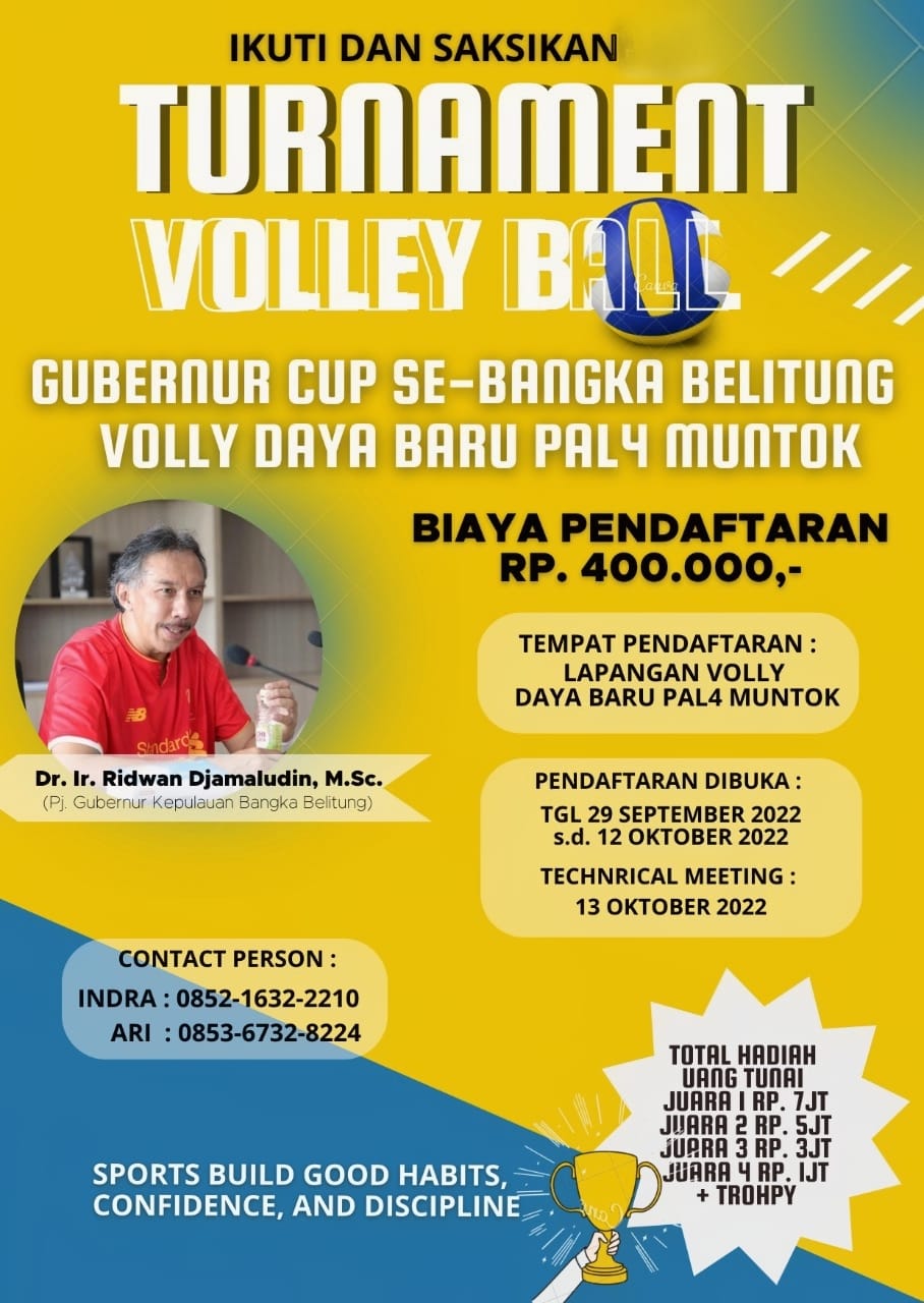 Dikabarkan Pj Gubernur Kepulauan Bangka Belitung Ridwan Djamalludin putra Babel daerah kelahiran Muntok Kabupaten Bangka Barat berkolaborasi dengan Volly Daya Pall 4 Muntok menggelar kejuaraan bola voli se-Bangka Belitung.
